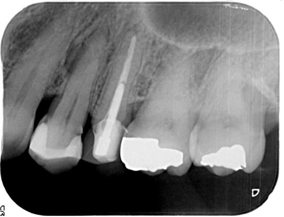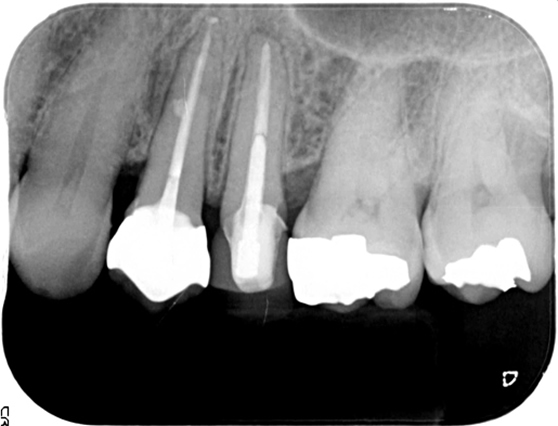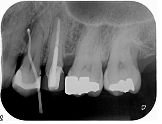 左上の5番が再治療しても歯茎の腫れが直らないとのことでしたが、当院での審査の結果、原因は左上4番(隣の歯)の神経が死んでしまっている事でした。左上4番の根幹治療を行い、その後症状は消失し経過は良好です。