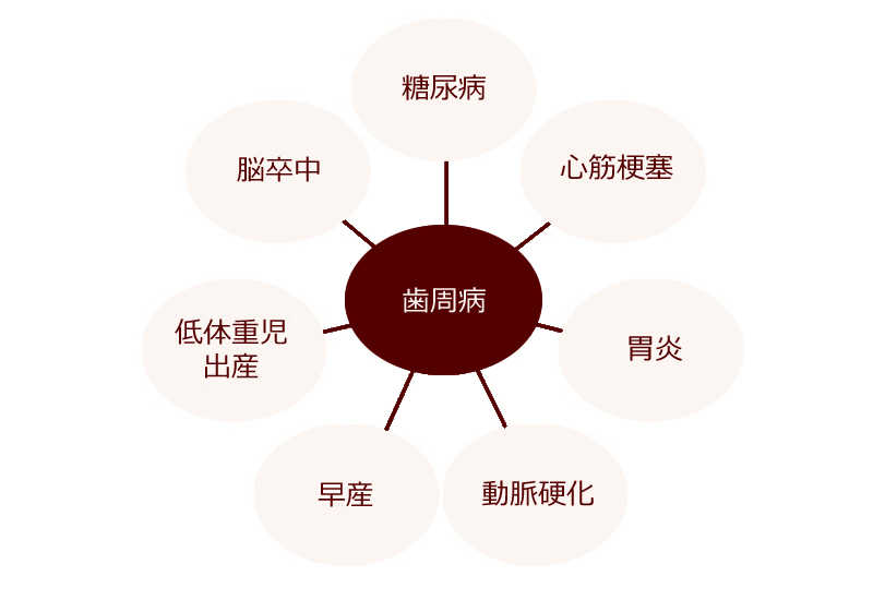 歯周病は「歯」だけの問題ではありません。歯周病にかかると、細菌が体内に入ることにより、全身疾患にも影響を及ぼすと言われています。
